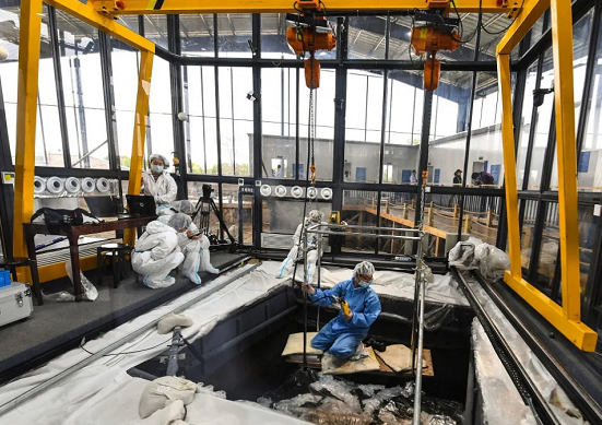 采用移動(dòng)龍門吊和電動(dòng)葫蘆的這種挖掘提取的方式對(duì)這些古文物起到了很好的保護(hù)效果。